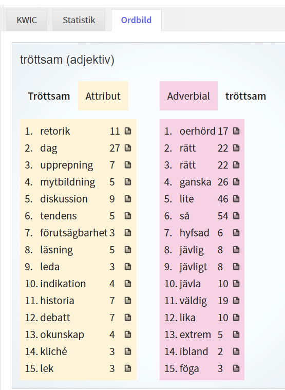 7. Förklara vad kollokationer är om eleverna inte vet. Diskutera sedan kollokationerna med eleverna och välj de vanligaste. Förklara vad en korpus är och att statistiken inte är ett ”facit”. Ordbilden vi får är ju inte bearbetad av någon människa, tekniken fixar inte allt.