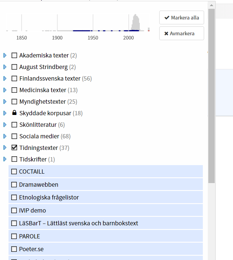 3. Avmarkera alla korpusar och välj sedan till exempel tidningstexter: