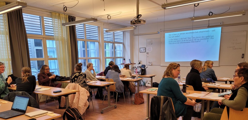 Det gick snabbt från tanke till handling. Fortbildningsdagen fick heta: Lättläst – Skönlitterärt läsande och skrivande på sfi och på andra nybörjarkurser i svenska och den gick av stapeln med 16 deltagare i en lokal på Studieförbundet Vuxenskolan i Uppsala. Fem minuters promenad från järnvägsstationen, mitt i centrum. Lunchen åt vi på Fröjas sal, fem minuters promenad från kurslokalen. Jag bjöd på allt.
